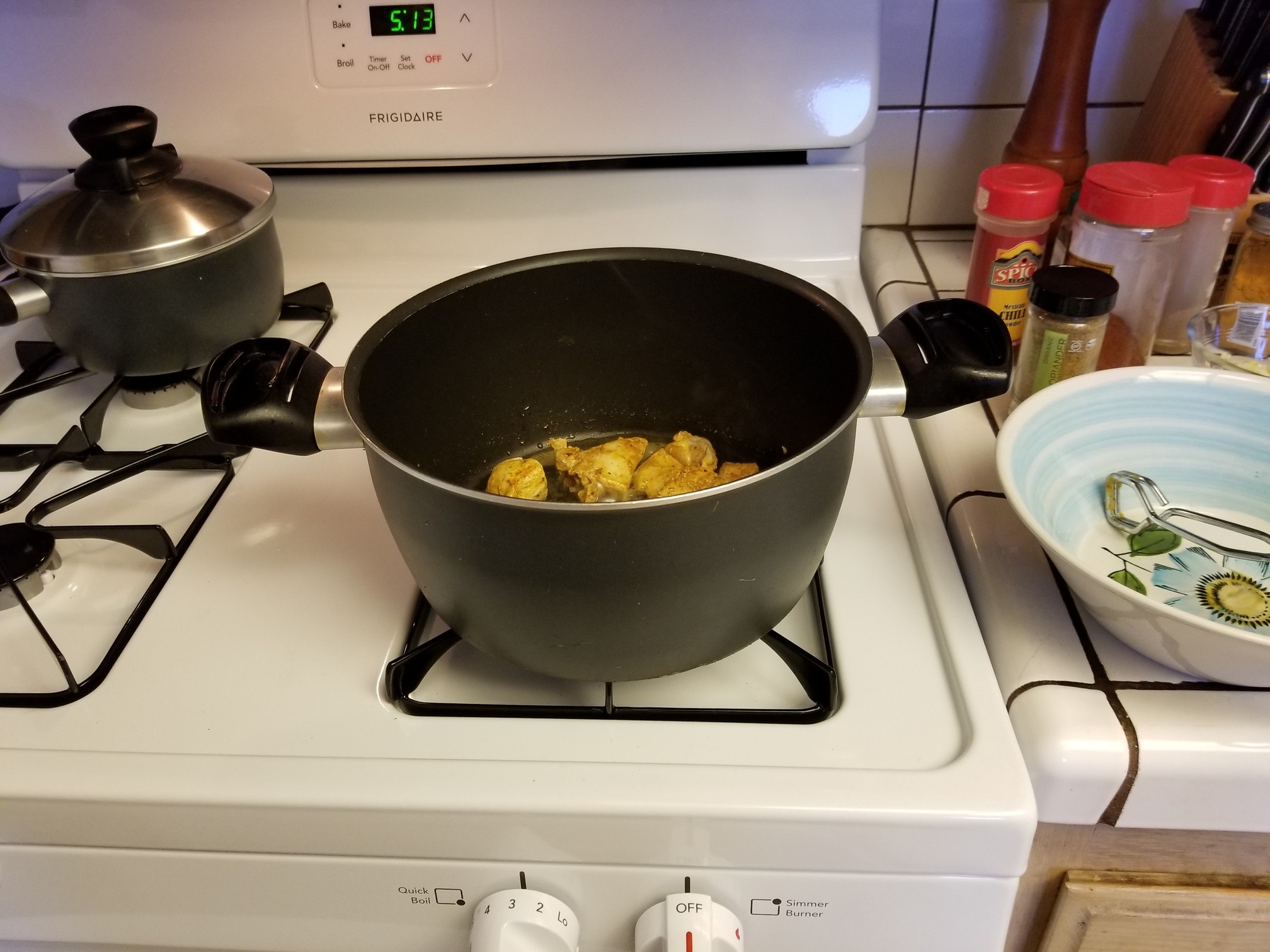 Work in batches here to avoid overcrowding the pan. Brown for maybe 3-4 minutes per side. The chicken will finish cooking in the masala sauce later so it doesn’t have to be completely cooked through.