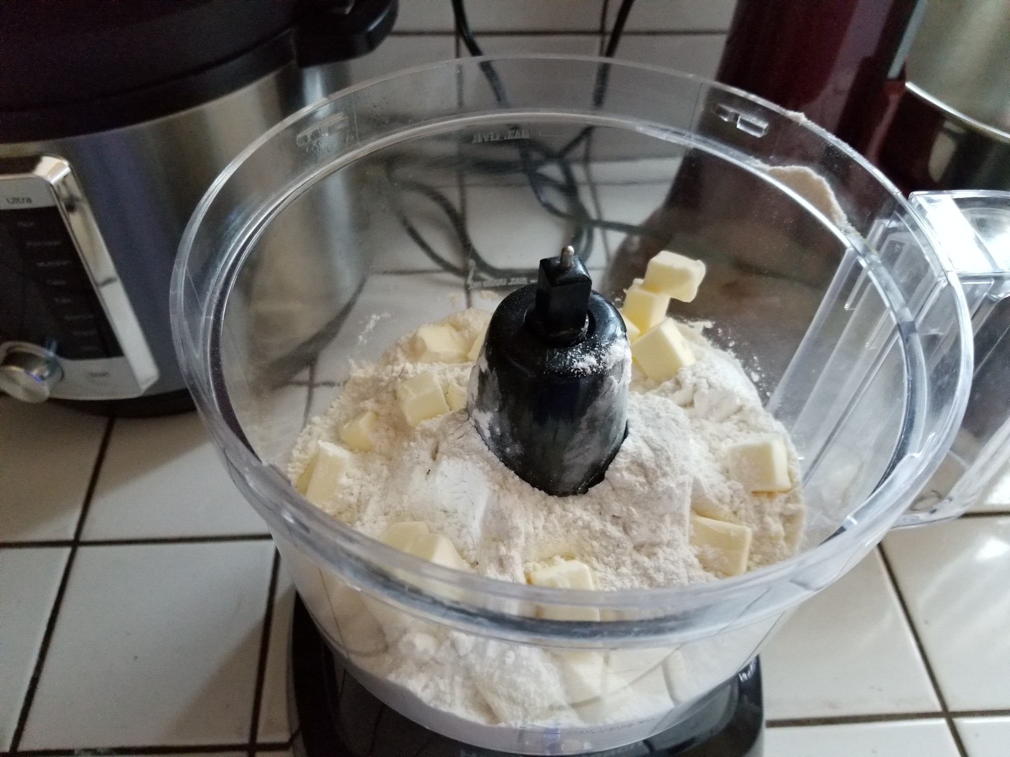 Add the flour, baking powder, baking soda, salt, sugar into a medium bowl and stir to mix. Dump these contents into a food processor then add in your cubed chilled butter.