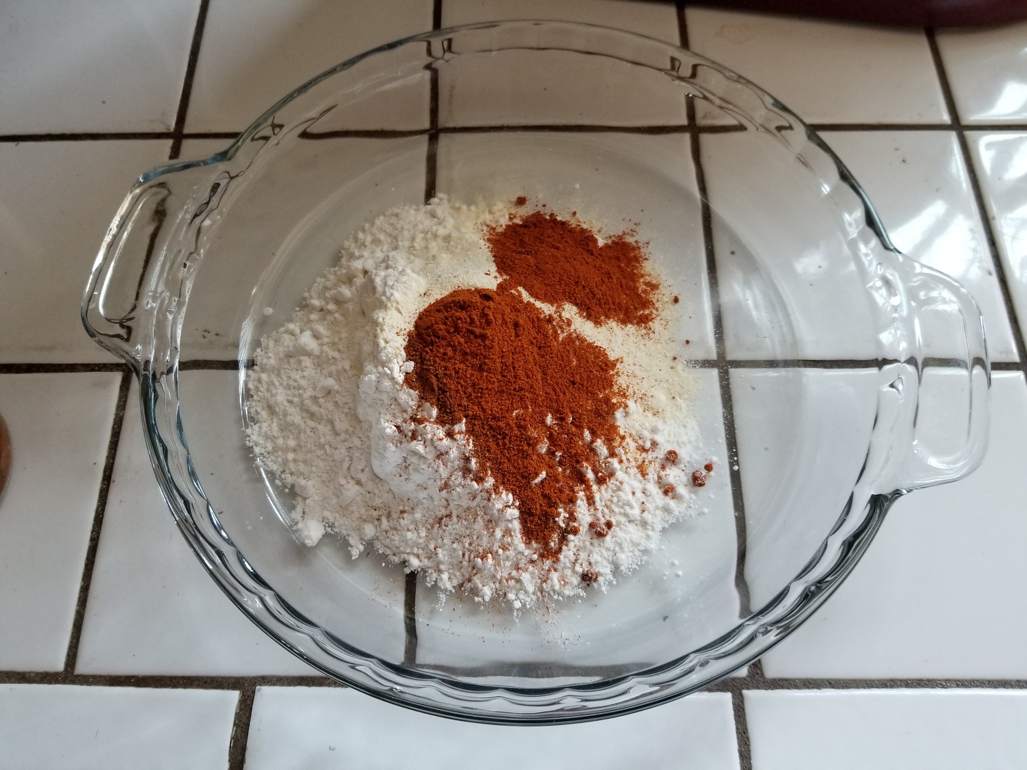Next let’s set up a station for the seasoned flour. Combine the flour, onion and garlic powders, the cayenne and the paprika
