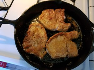 You can call this a dredge but all we will be doing today is giving the pork chops a good covering of the seasoned flour. If you were building a thicker crust you could dredge in the flour then into an egg wash then back into the flour for a proper dredge. We don’t need that much breading today so just go with a single coating of the flour.