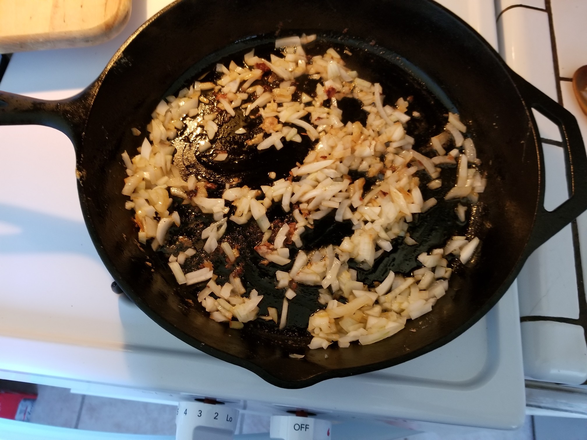 First thing we are going to do is toss our diced onion up in the cast iron with all of that lovely crispy, porky tastiness still in it.