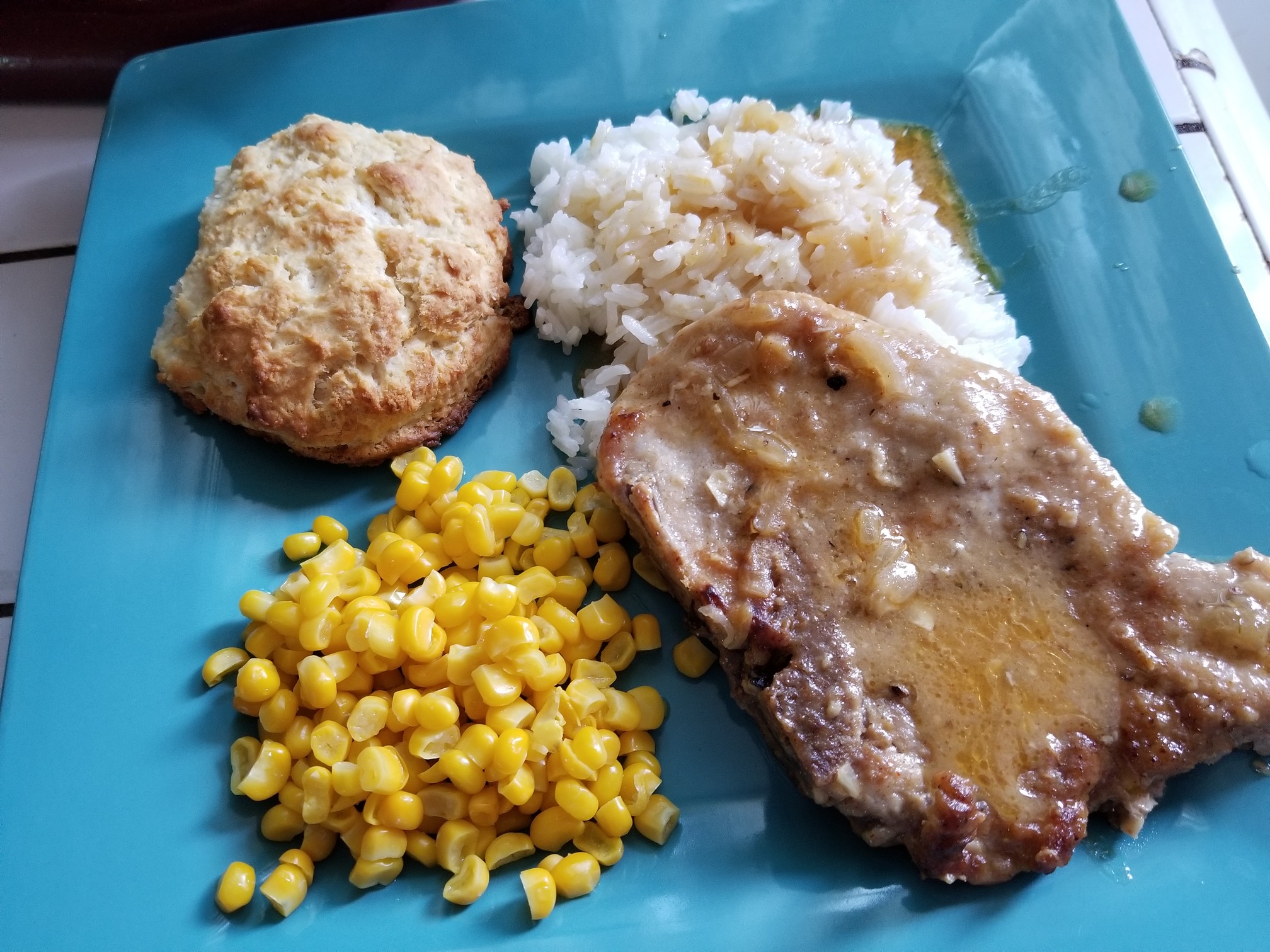 From the top left that’s a homemade buttermilk biscuit, rice and gravy, a smothered pork chop and some sweet corn.