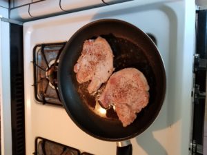Once your cast iron is “het up” and ready to party, get that pork up in the pan!