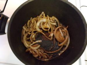 Next we are going to deglaze the searing pan with the sliced onion.