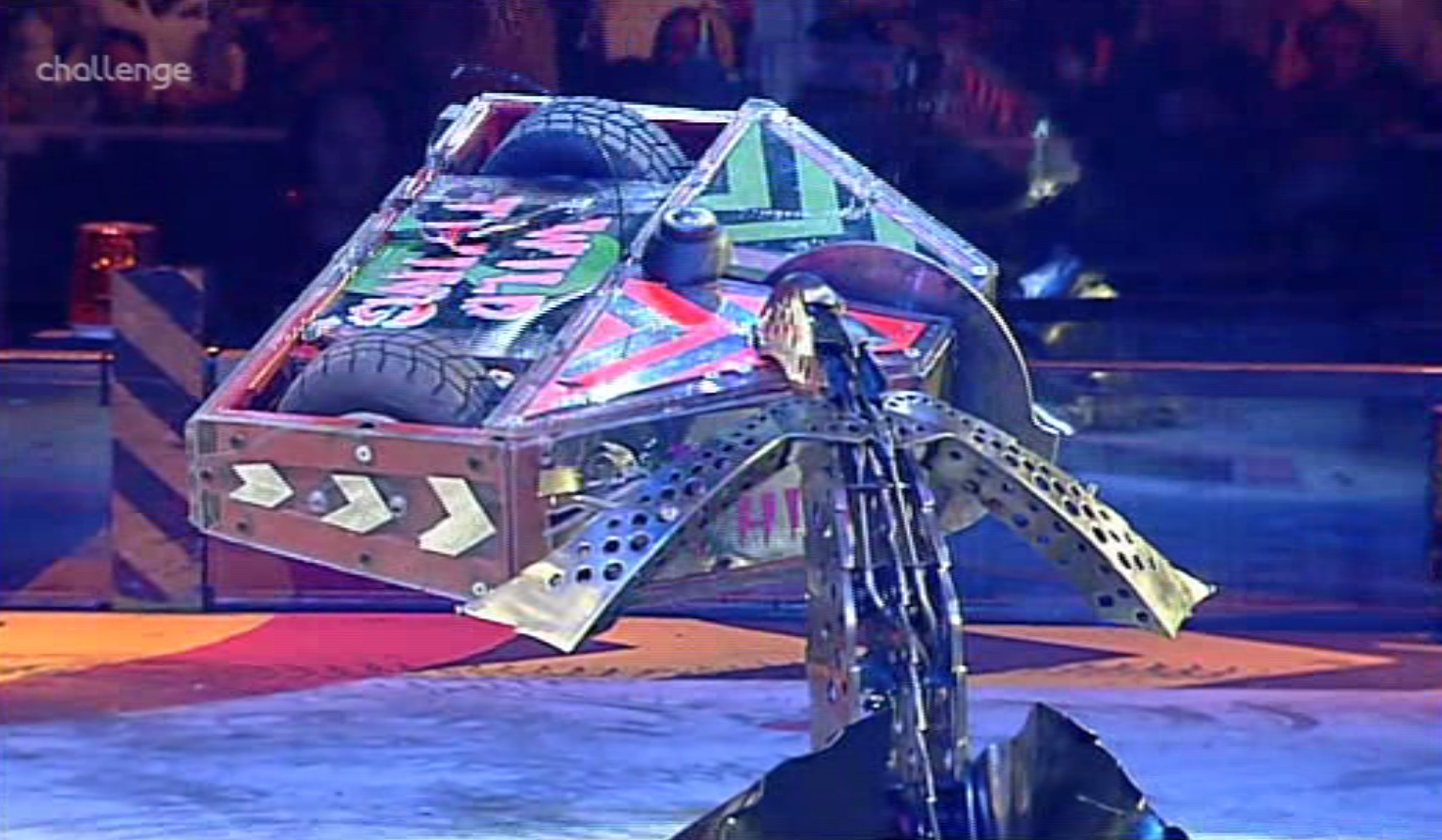 And lo and behold, as the two robots came together, Warhead got a shower of sparks on Warrior’s wedge, but was sent skidding and nearly overturned while turning. In prior seasons (okay, the Comedy Central season and Season 1) they would keep the wings up for hits like that, so that yes, like Chomp they’d go onto their side, but the wings would self-right (quick poll, cooler srimech, Razer or Warhead, I do go with Razer due to the infamous “Razer salute“). They don’t attack wings up anymore, instead hitting with the wings down. I think I asked them why in an AMA a while back and it was so that way hopefully they wouldn’t topple over, since it takes a bit of time to re-right.