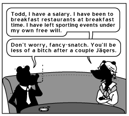 No morning game? Goddammit! Sure it made our collective eyes bleed, watching so much football in one day but it was the good kind of blood-letting. I think game-time has been shifted because the sponsors were whining about not getting enough bang for their ad bucks. Who is to blame for this? West-coasters, that’s who. They’d all be wasting their time being fed breakfast in bed by their super model girlfriends/mistresses. They’d be taking their sweet time wrapping themselves into their ermine housecoats, getting into their scale model Lamborghini’s and driving the sixty yards over to their sunken living rooms with the eight separate tv monitors suspended from the ceiling. Makes me sick! [faces West, shakes fist]