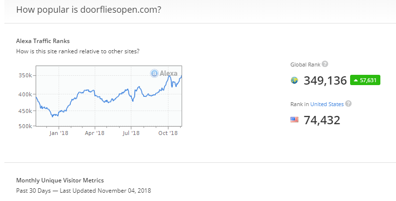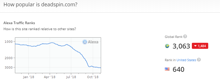 I have one of my students using Alexa.com‘s free internet stats as part of his specialized learning about IT. (He looks up things like Amazon, CNN, various gaming sites he likes, et cetera. It keeps him busy.) Every so often, I check in to see how we’re doing as an entity. Here’s what it looked like back on October 2nd: