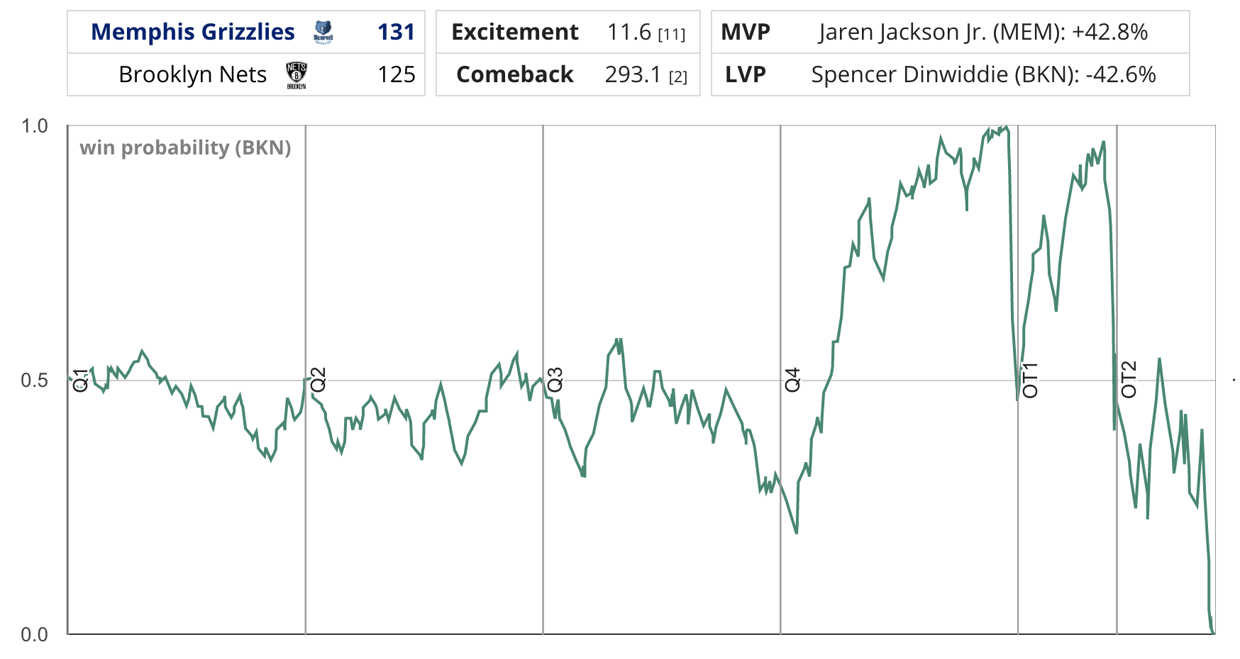 That’s right, the Brooklyn Nets had a cool 99.7% chance of winning that game in regulation, and then a much more modest 97% chance of winning in the first overtime.