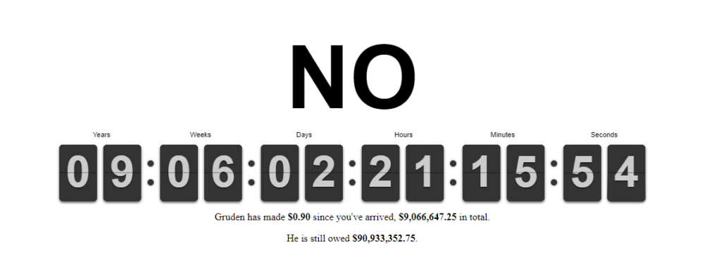 It’s the Gruden salary countdown clock. It lets all remaining Raiders fans know exactly how much Jon Gruden is making while dismantling Oakland prior to moving to Vegas. It’s fun to see how many seconds it takes him to earn my hourly wage.