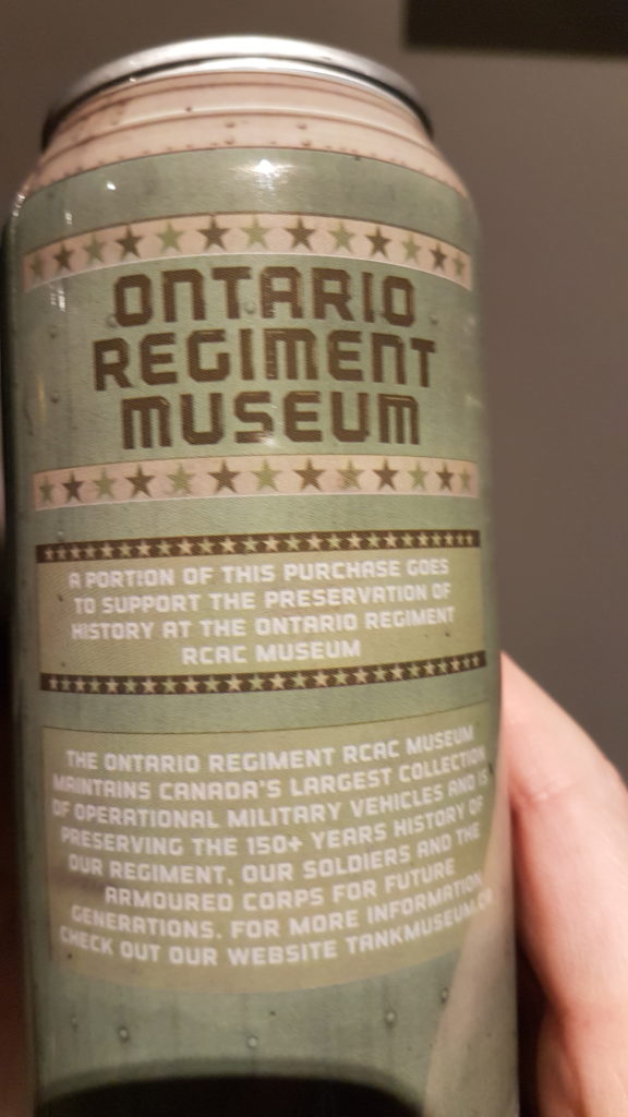 Day 3’s beer is the “Armoured Ale” from Brock Street Brewing. This is another lighter beer at 4.1%. Again it’s a nice clean crisp beer. Not much of an after taste and not hop-y at all. If you zoom in on the second picture of the can, it tells you that part of the proceeds from this beer go to support the “Ontario Regiment Museum”, which is kinda kewl. I didn’t know that this museum was even a thing, so may need to find it and visit.