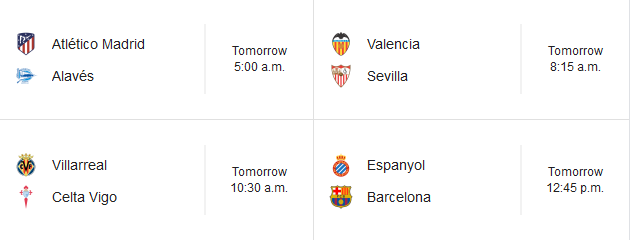 Third place Atletico Madrid (25 points) is playing 4th place Alaves (24 points). Currently, Atletcio is on a 6 game unbeaten streak against Alaves, with the last 3 games being clean sheets.