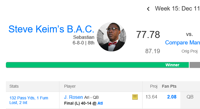Anyways, I am just now remembering that you all deserve results from last week. I straight up forgot. I guess I was too busy WINNING fantasy while starting Josh Rosen!