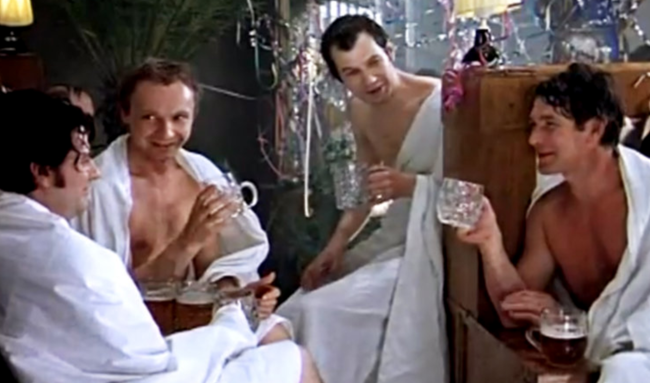 Anyway, after The Big Ж tells her that he’s going to propose at midnight, he goes off to the bathhouse with his boys, as one does in Mother Russia. Zhenya tells friends that he’s got big plans that night, and agrees to have just one drink. As is the case when anybody says that in a movie, he proceeds to get absolutely ruined. After driving vodka down for a few hours, the boys go to the airport. One of them has to get to Leningrad because…who cares? It’s not important, really, and I haven’t seen this movie in two years. But because everybody is stone cold drunk, Ж-Dog gets on the plane instead, and flies out to Leningrad.