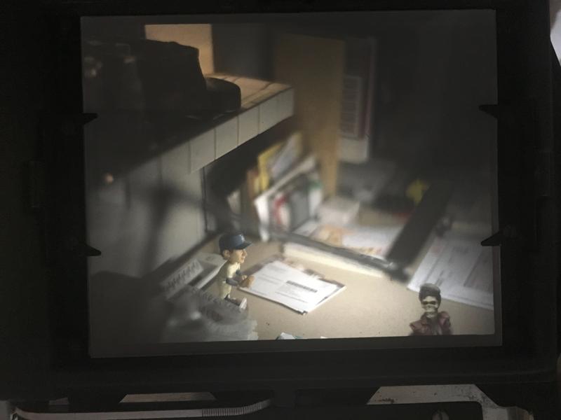 Here’s an iPhone photo of the 4×5″ ground glass of a 1951 Speed Graphic with a 1943 Kodak Aero Ektar 7 ½” reconnaissance barrel lens that opens to f/2.5 and has a depth of field of about a half-inch and has an outrageous bokeh. Top photo I took 20 minutes ago. I got the Sandy Koufax bobblehead on the eponymous night at Dodger Stadium and Rockabilly Skull belonged to my late brother. Lower photo of Xmas light I took last year, also with an iPhone. Bottom photo is Xmas lights shoot.