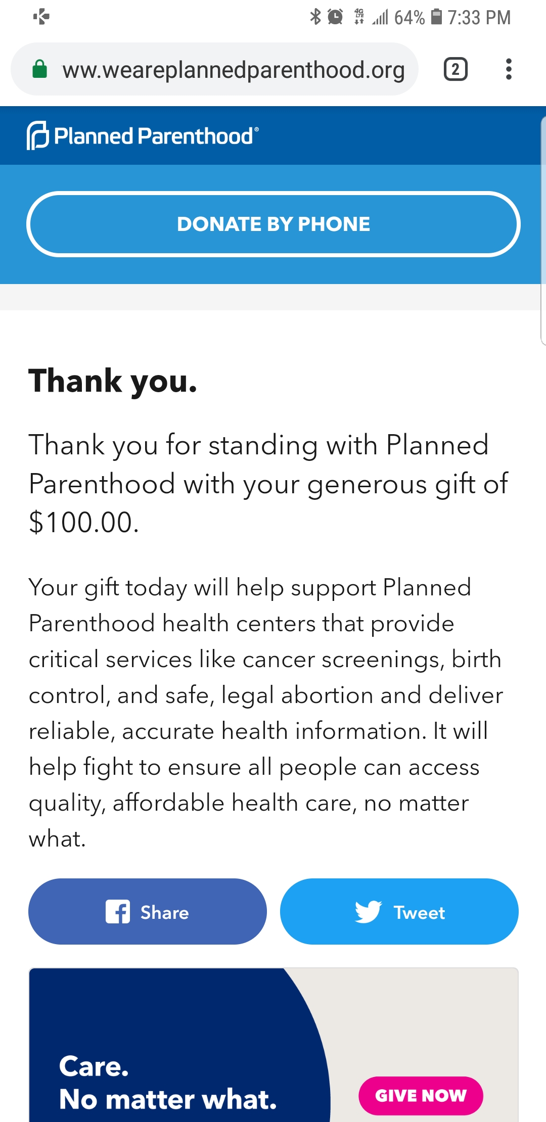 Nice of you to donate. Planned Parenthood does a bunch of services that I am proud to support, save one thing.