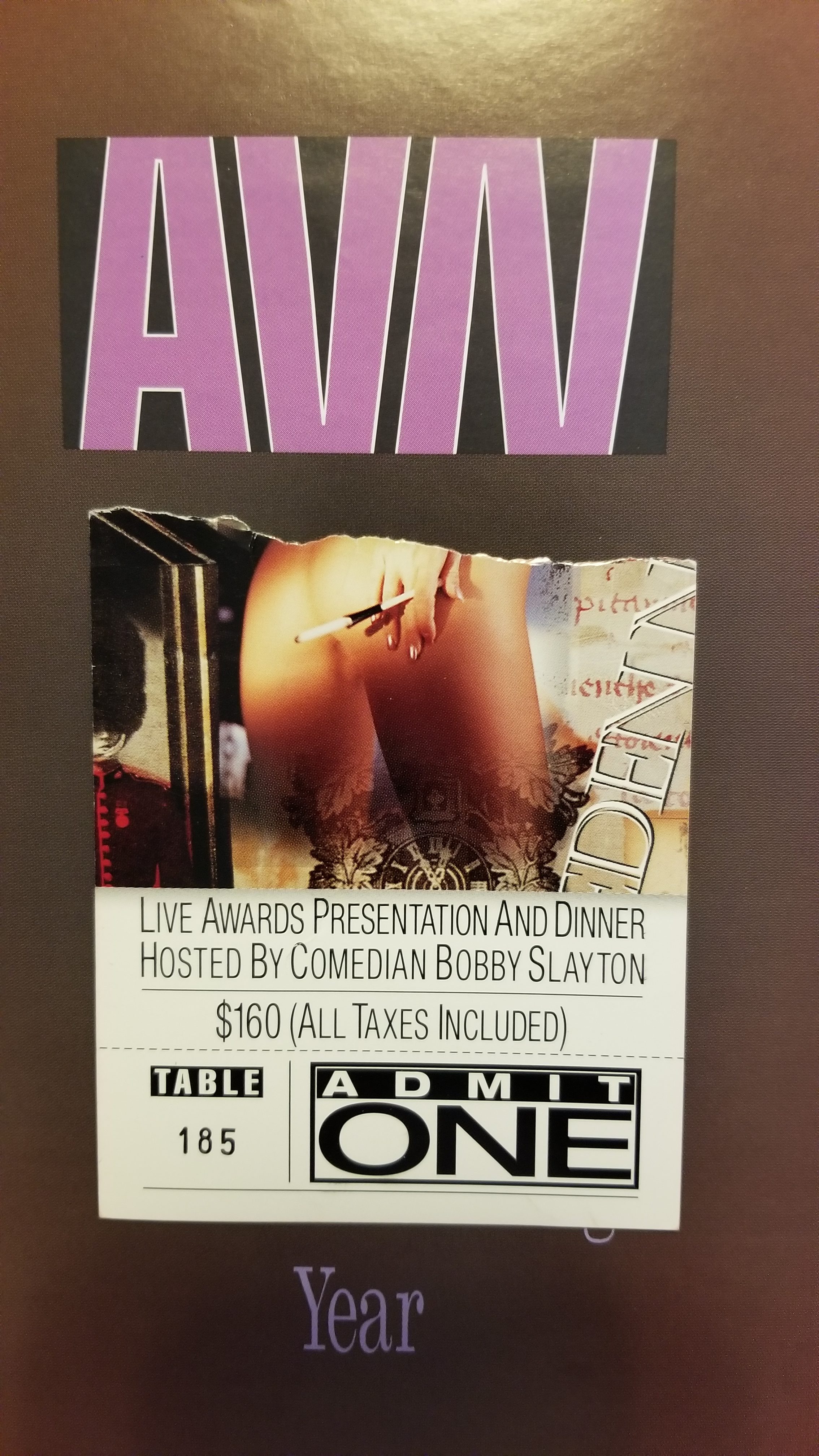 Curious, I went over to one of the dudes and asked what the deal was. He was cool and gave me the scoop on what was going to happen. The Show was just starting to get big that year, so they were going to sell a limited number of tickets to the public. By and large, it had always been an industry awards ceremony with dinner served and speeches. He said, “It might as well have been the Western Region Refrigerator Supplies Sales Awards Dinner. But porn. Except now they’re doing dance numbers and a comedian is hosting. They’re trying to make it a new big thing and it’s going to be taped.”