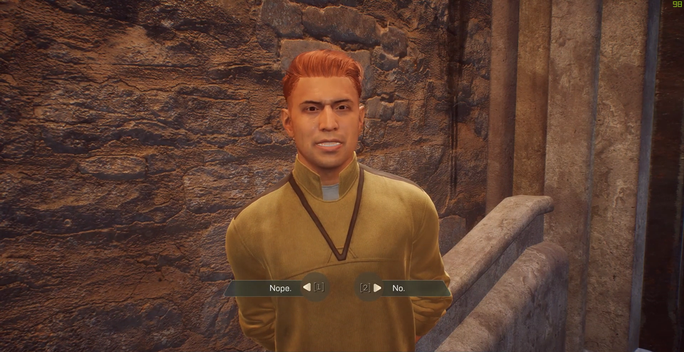 In other BioWare games, when interacting with another character, you can ask questions if you wanted to know more about something. Instead in Anthem, you have to sit there and listen until you get the chance to make choices like this: