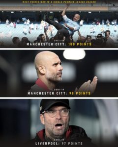 The Premier League had a banner year. Four of the top five teams in the EPL were this season’s European finalists, with Man City taking a bold stand for protectionism with the domestic treble. Liverpool came in second in the EPL, with 97 points: