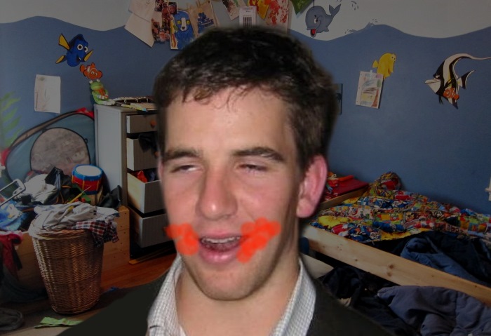 ELI MANNING and DANIEL JONES have returned to ELI’s room. ELI’s cheeks are covered with tomato sauce from the pizza rolls he just scarfed down.