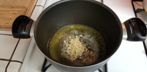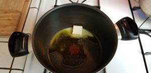 Get out a deep skillet or Dutch oven and add in 2 tablespoons of butter and 2 tablespoons of olive oil and get this over a medium heat.