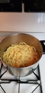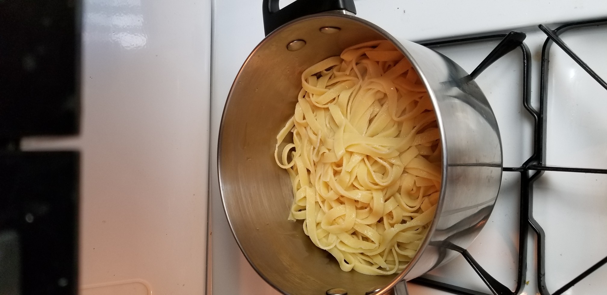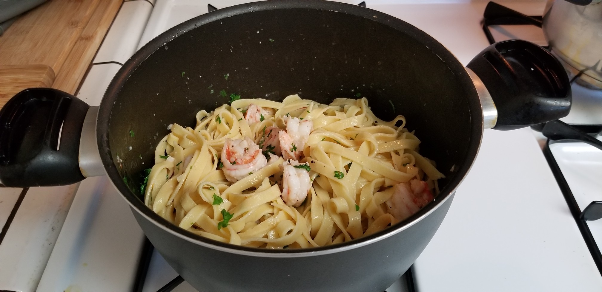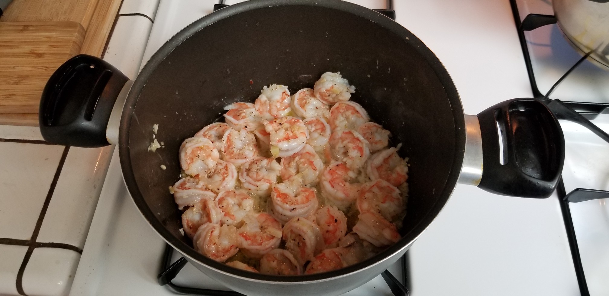 That’s our cooked pasta and the parsley. Now get them shrimp in there. The fuck you waiting for?