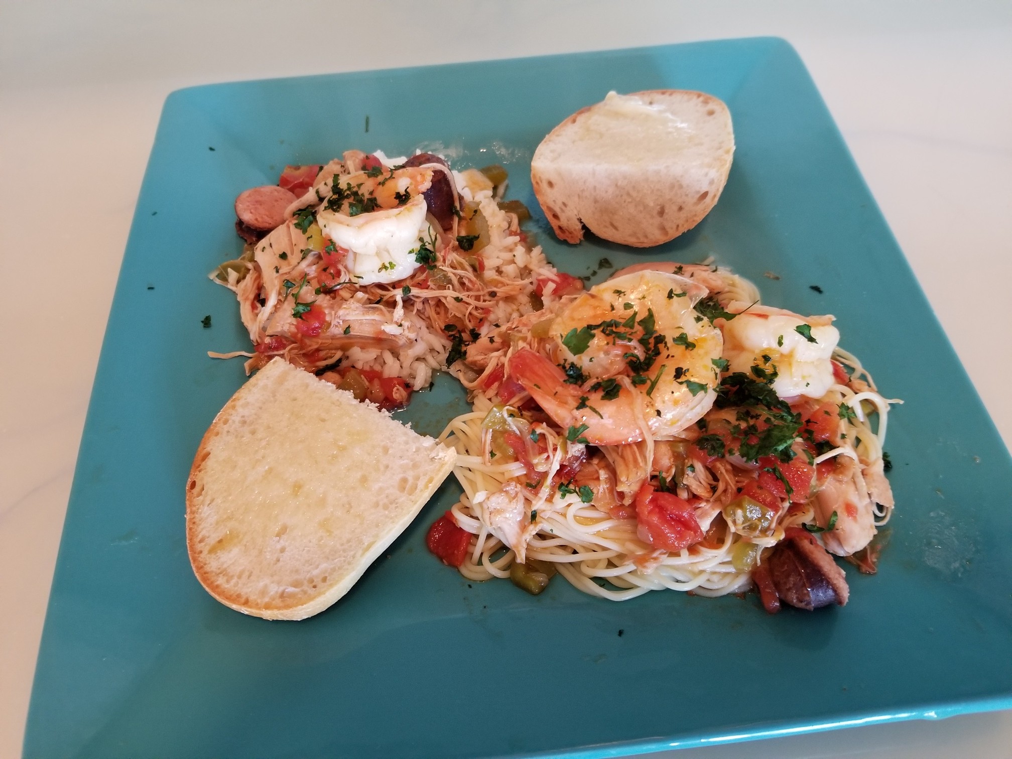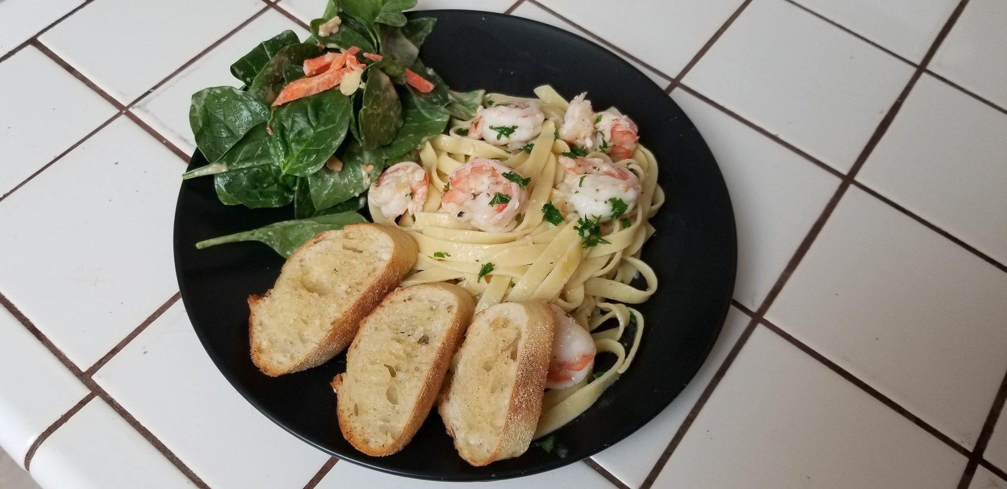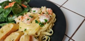 Right now I’m on a tight low-carb diet, and I look at this awesome shrimp scampi with homemade pasta and bread and of course shrimp and it’s just killing me.