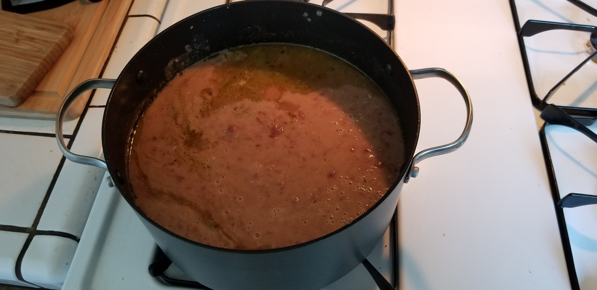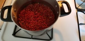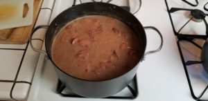 Bring to a boil, then reduce the heat to “LOW”, cover with a lid and let simmer for two and a half hours stirring occasionally. When the beans have cooked for the allotted time we’re going to mash or blend about half of the cooked beans.