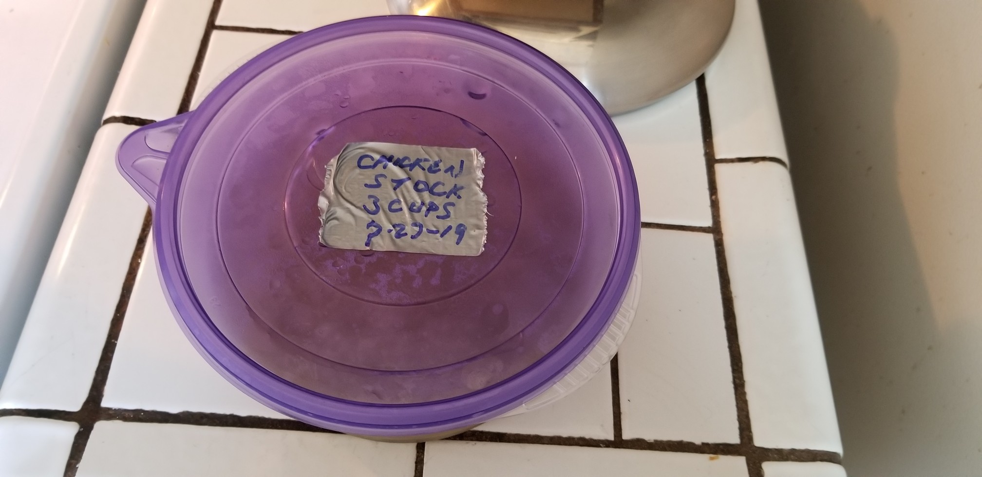 The label says “Chicken stock, 3 cups” and has it’s “born-on” date. That’s because I store the stock in the freezer and it’s a good idea to know how much stock is in there, prior to defrosting. Yes, I really do label my containers with duct tape that’s been written on by a sharpie.