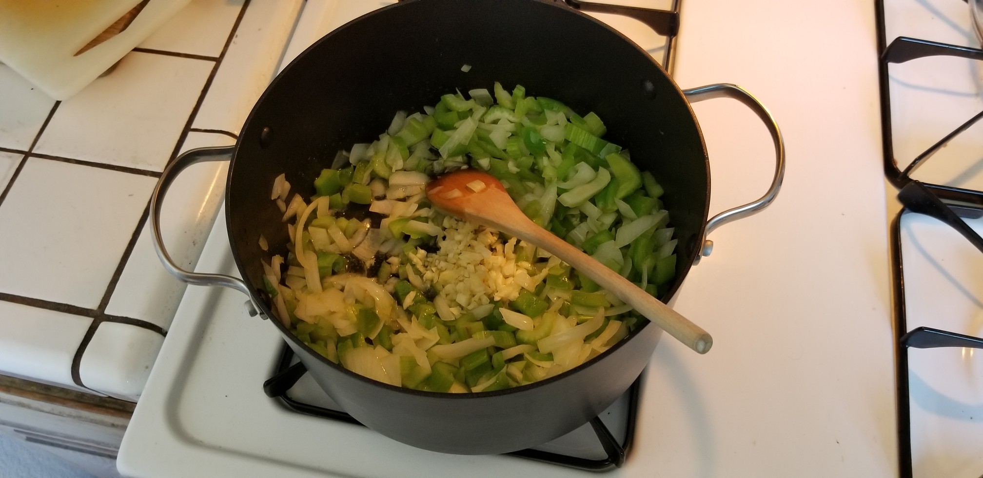 Get a good size Dutch oven over a medium heat and then add in the olive oil. When the oil is hot add in the “trinity” to saute.