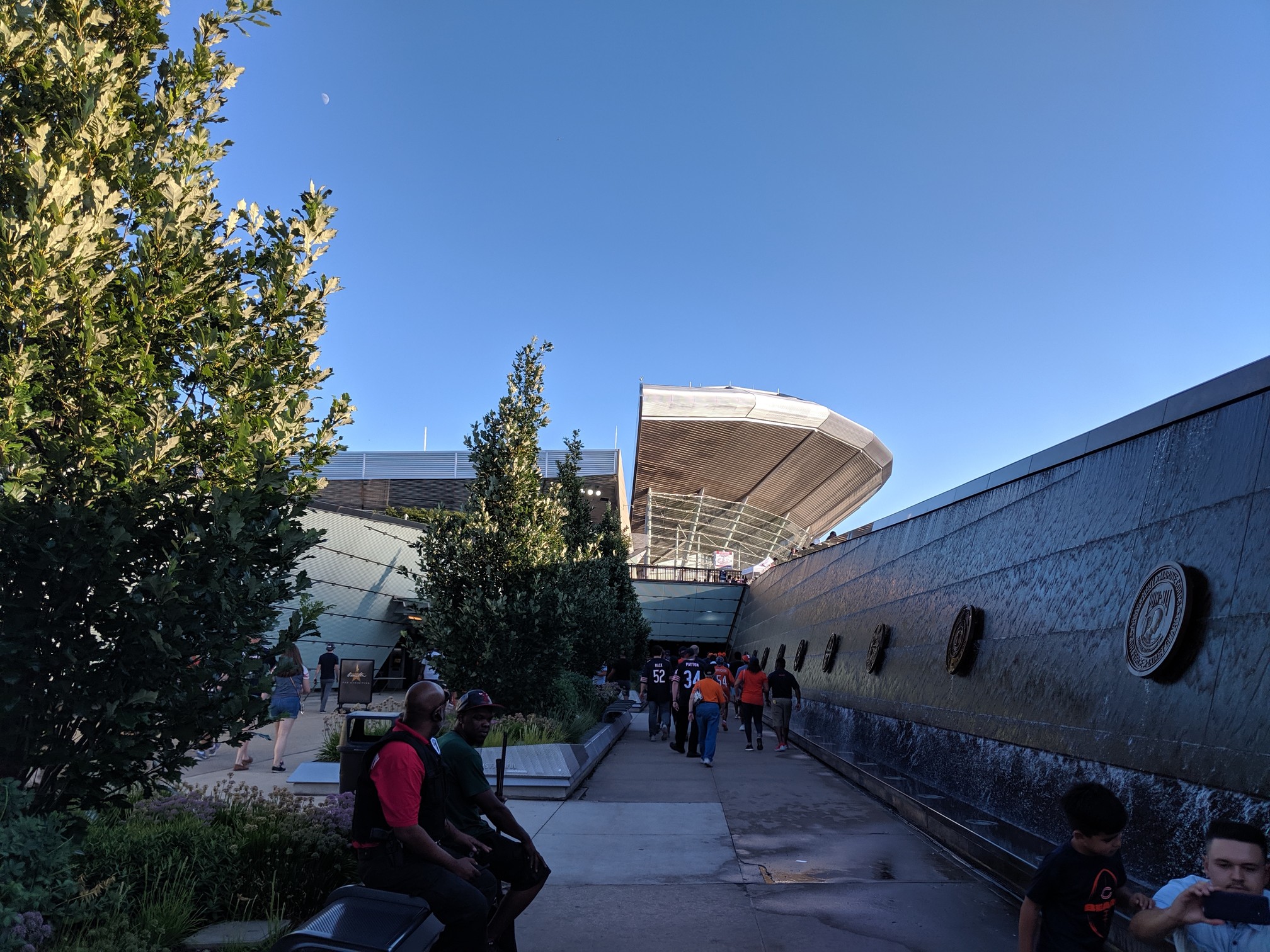 It all starts with the approach. We took the blue line in to the red line, grabbed some food and a beer, and then walked to the stadium from the north. That meant going alongside some armed forces insignias and a fountain-like structure as we submerged toward the base of the UFO. It was also Bronko Nagurski bobblehead doll night, but somehow despite being there well before kickoff, we weren’t given the piece of paper required to turn in at the station giving away the bobbleheads, and even though there were still a metric asston of them at said station 5 minutes before kickoff, they wouldn’t give me one. Dicks.