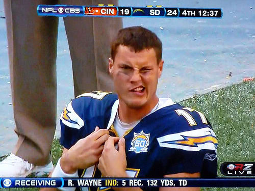 My hatred for Rivers is deep. He misses throws at the end of games a few times every season, then throws a downright tantrum about something like a WR out of place, a bad block, someone choking him, or court-ordered chemical castration. None of these are valid excuses to act like a dick with that punchable face. Frankly, I’m not sure how anyone hasn’t really punched him in the face mid-game. Are people afraid of the hundreds of rabid fans in the stands? At least 2 hundreds of fans? Maybe more? Nah.