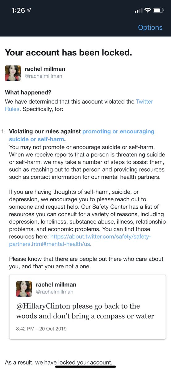 Wish I could remember who it was, but someone got suspended for the same reason for tweeting that Hillary should go into the woods without food or a compass.