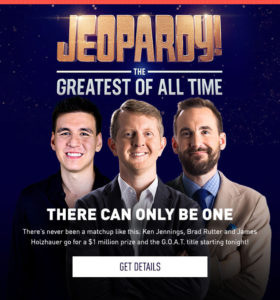 - Jeopardy – the GOAT tournament: Tuesday thru Friday – 8:00PM ET; PT / 7:00PM CT; MT