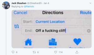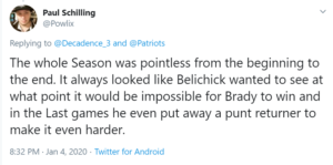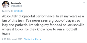 There we go. The combined delusional rage that only a Pats fan can muster – switching to Jacksonville because of one loss, and that the coach threw the season to get rid of his QB.