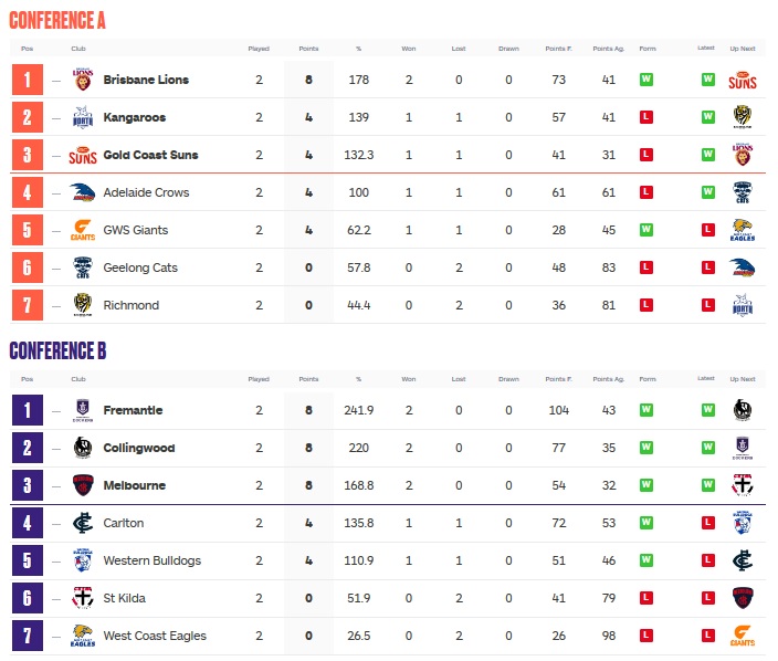 Brisbane continued in the same direction they started in last week. Sadly, so did Geelong. Brisbane stays on top of the ladder in Conference A. Geelong falls to 0-2. 39-20 was the final in that one.