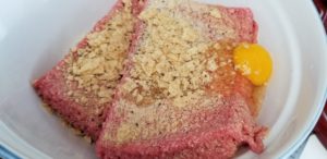 That’s some salt, pepper, garlic powder, onion powder, crumbled up corn chips (it’s a right family thing) and an egg.