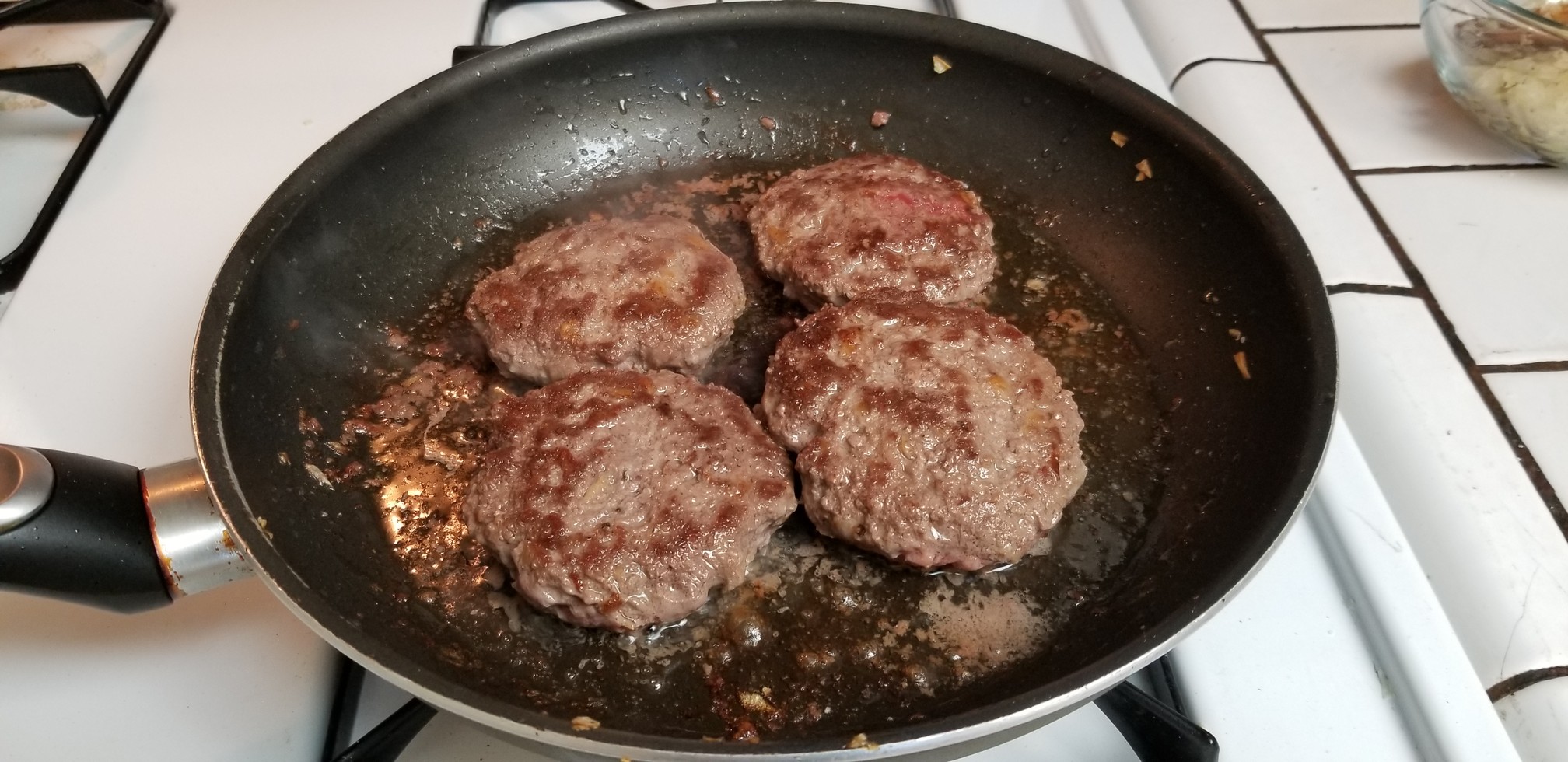 What we’re going to do first is cook the burgers in the same pan we sauteed the onions, thus imparting a delicate yet subtly piquant onioney goodness to the burgers.