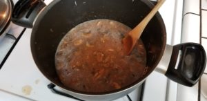Next We’re going to dump that lovely beef fat from the skillet into a dutch oven to finish the gravy. Add the mushrooms and the sauteed onions to the Dutch oven and cook for about 7 minutes or until the water has evaporated from the shrooms . Then add in the beef stock, Worcestershire, thyme and a sprinkle of salt and pepper.