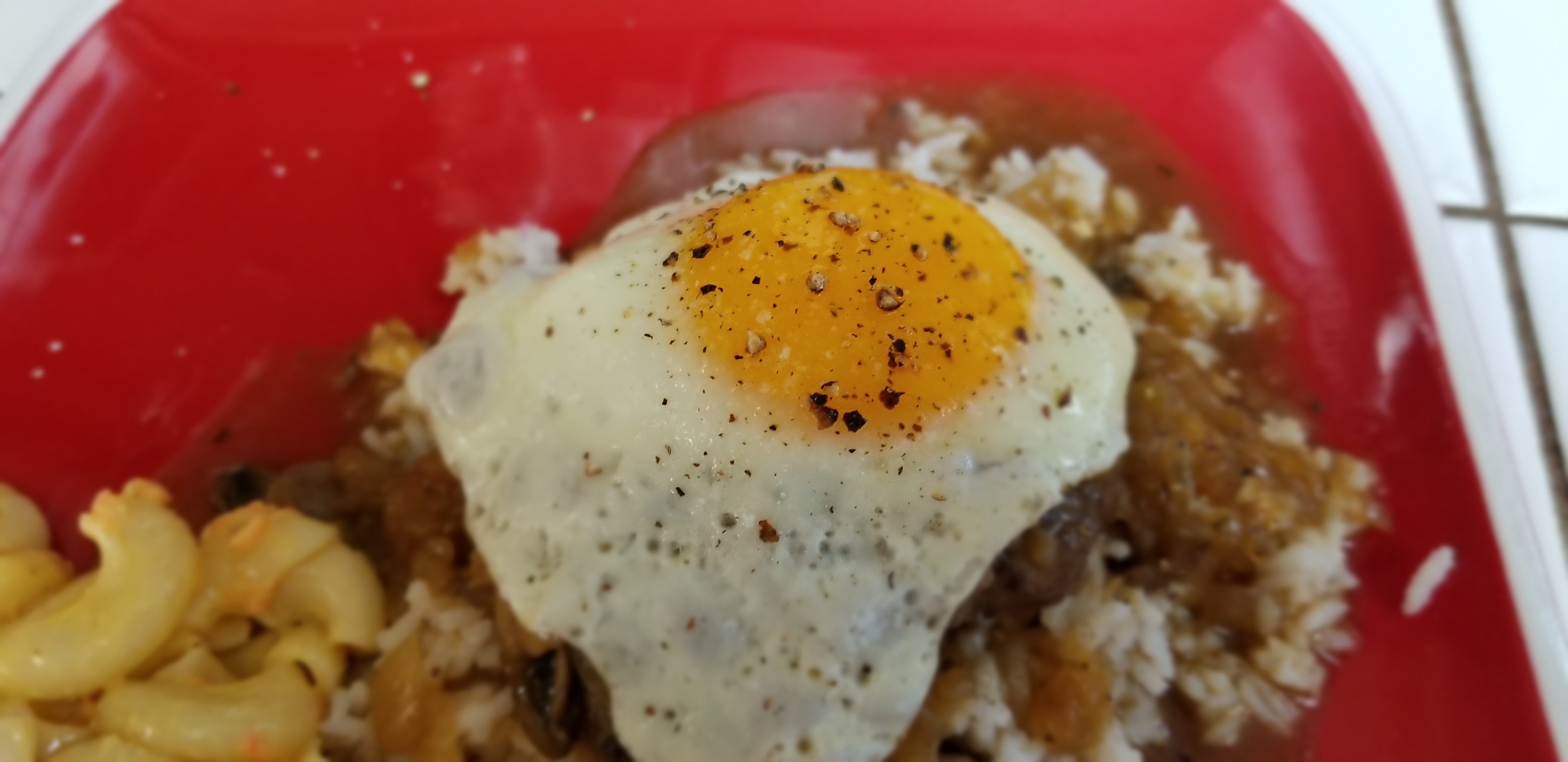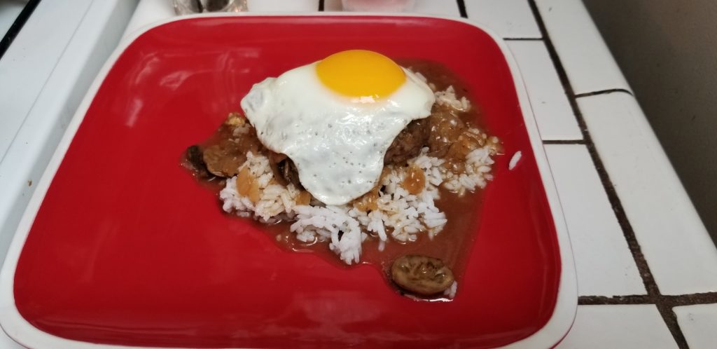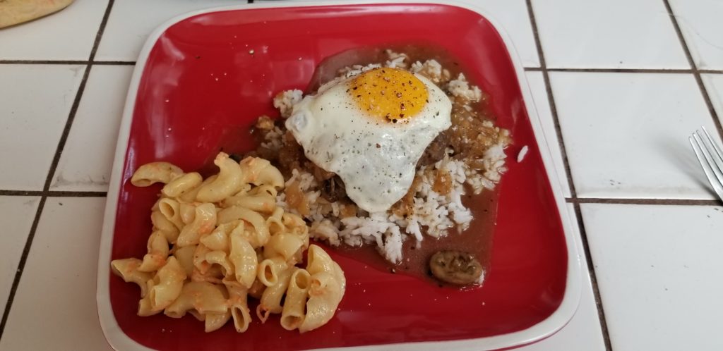 It’s a big goddamn scoop of rice that’s topped with a seasoned burger patty, covered in a brown gravy then topped with a fried egg. Served alongside a scoop of homemade mac salad.