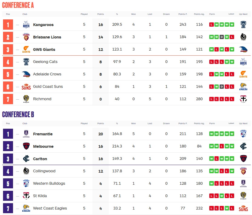 Well lookit this. Brisbane ran smack into the Dockers. And kinda got their arses handed to them. Brisbane isn’t out of the running just yet of course. But with a draw and a loss over the past three weeks they are looking a lot less reliable. Freemantle on the other hand looks poised to take Conference B with ease and likely roll through for the Premiership. 50-32, the Dockers put the Lions into “Dry Dock” (get it?)