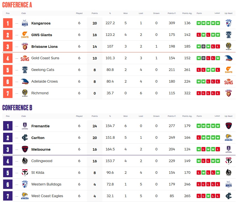 Freemantle and North Melbourne still appear to be on a collision course. I’d give Carlton and GWS an outside shot as sliding in. Collingwood has a chance. Brisbane has apparently collapsed.