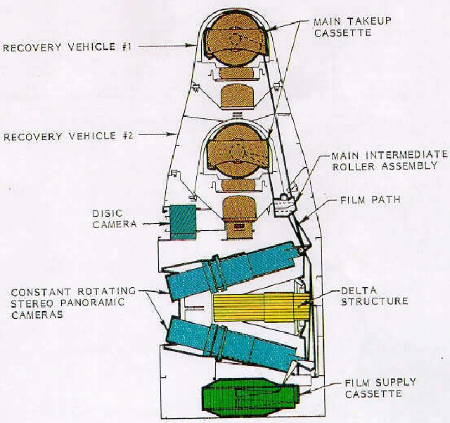 Here’s the Corona spy satellite, which took stereoscopic 70mm pictures with swiveling lenses, processed the film on-board, ejected the film, which then did a fiery reentry into the atmosphere and was hooked mid-air by a special plane. 144 different satellites were launched. At first, the recovered film had fogged edges; this was due to a well-known phenomenon in photography where unexposed film is dragged across rollers and generates static sparks. This phenomenon was already called the corona effect. Weird!