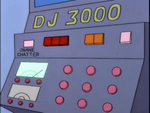 DJ 3000 sits alone in the office, a single LED blinking lazily.  It is very quiet.  A flush is heard down the hallway.  A few moments later the PRODUCER enters, wearing a bathrobe.  A toothbrush is poking out of his mouth.  As DJ 3000 cycles out of sleep mode the PRODUCER finishes brushing his teeth and spits the toothpaste residue into a coffee cup.  The PRODUCER then settles down behind the mixing board and starts punching buttons.