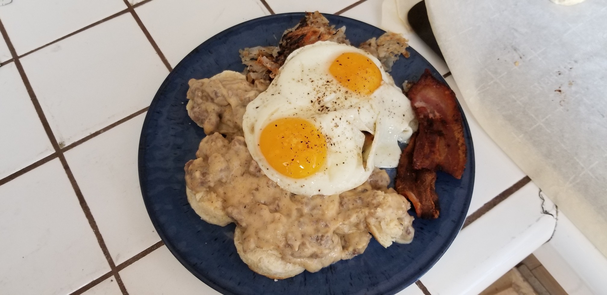 Don’t worry, we’ve got more than just that. I’m making some sausage gravy, hash browns, bacon and eggs too.