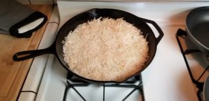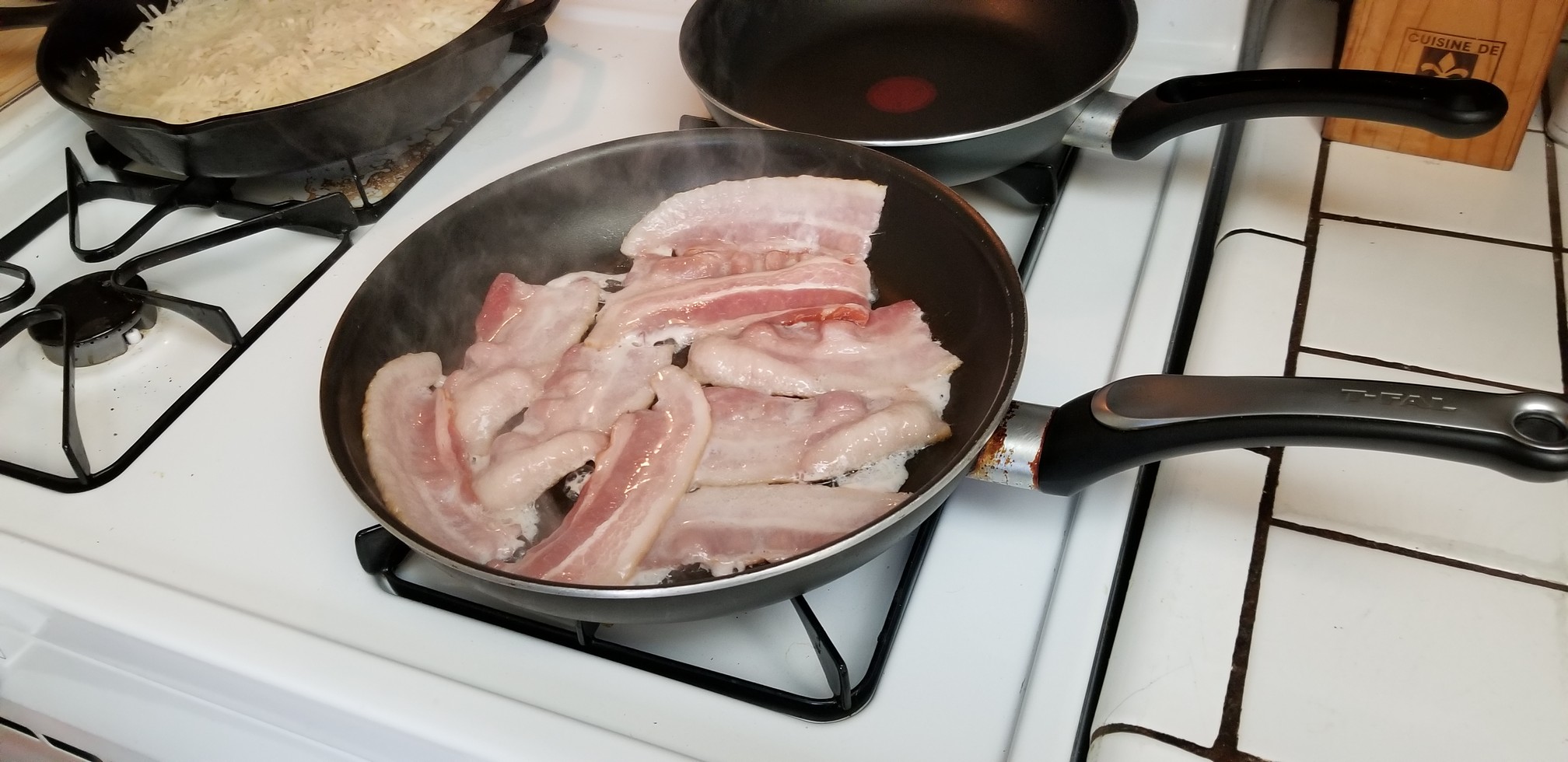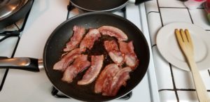 Once you have the hash browns started let’s get some bacon in another pan.