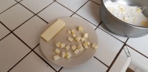 After the butter has chilled, dice the butter into small chunks think small dice here.