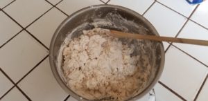 When the butter has been cut into the traditional “small pea” size add in the milk.