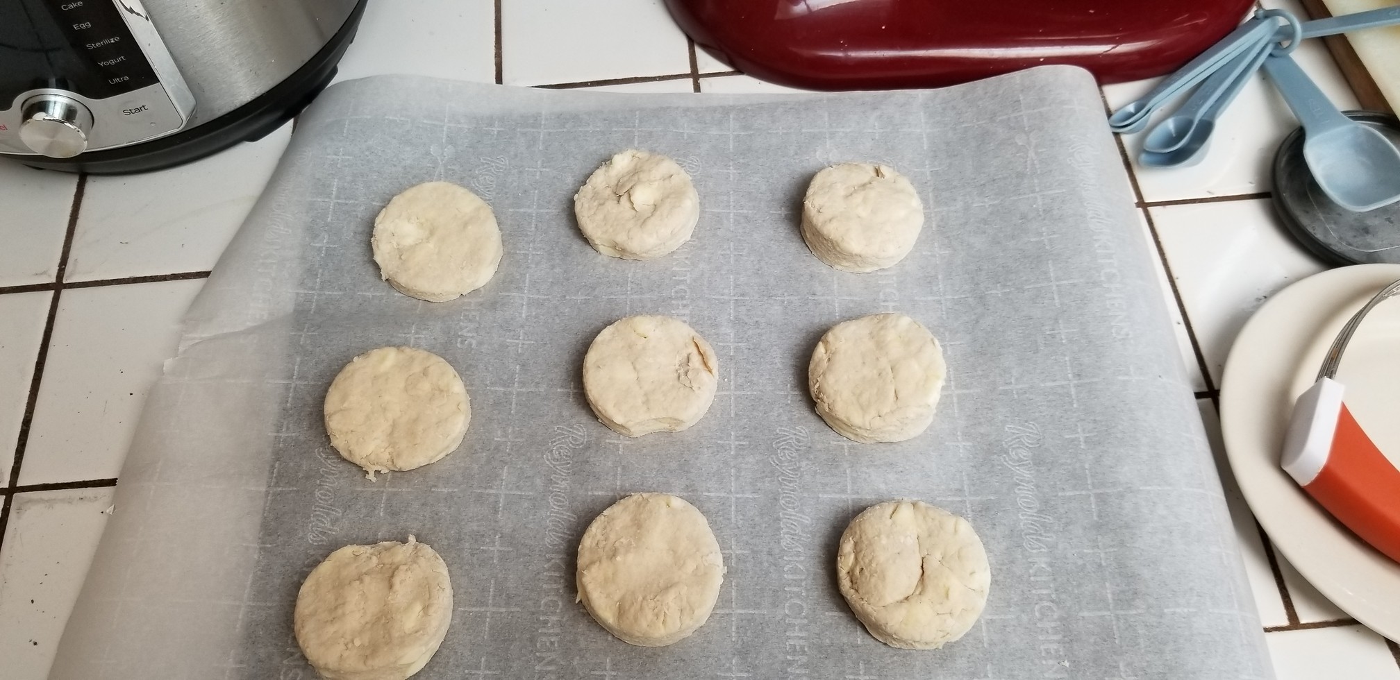 Reshape the dough as needed and continue to cut out the biscuits until you’ve used up the dough. Obviously I got 9 biscuits from this batch.