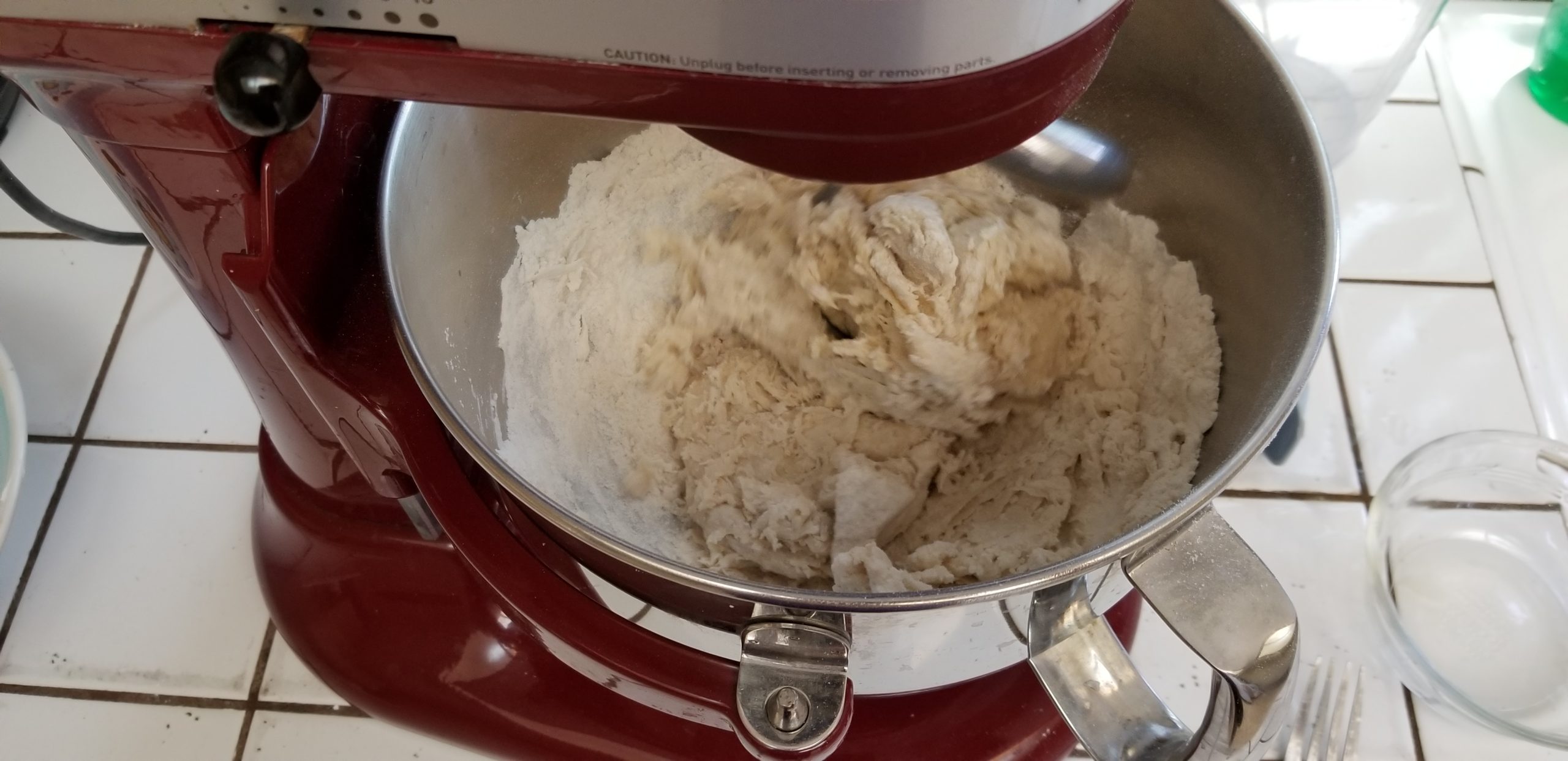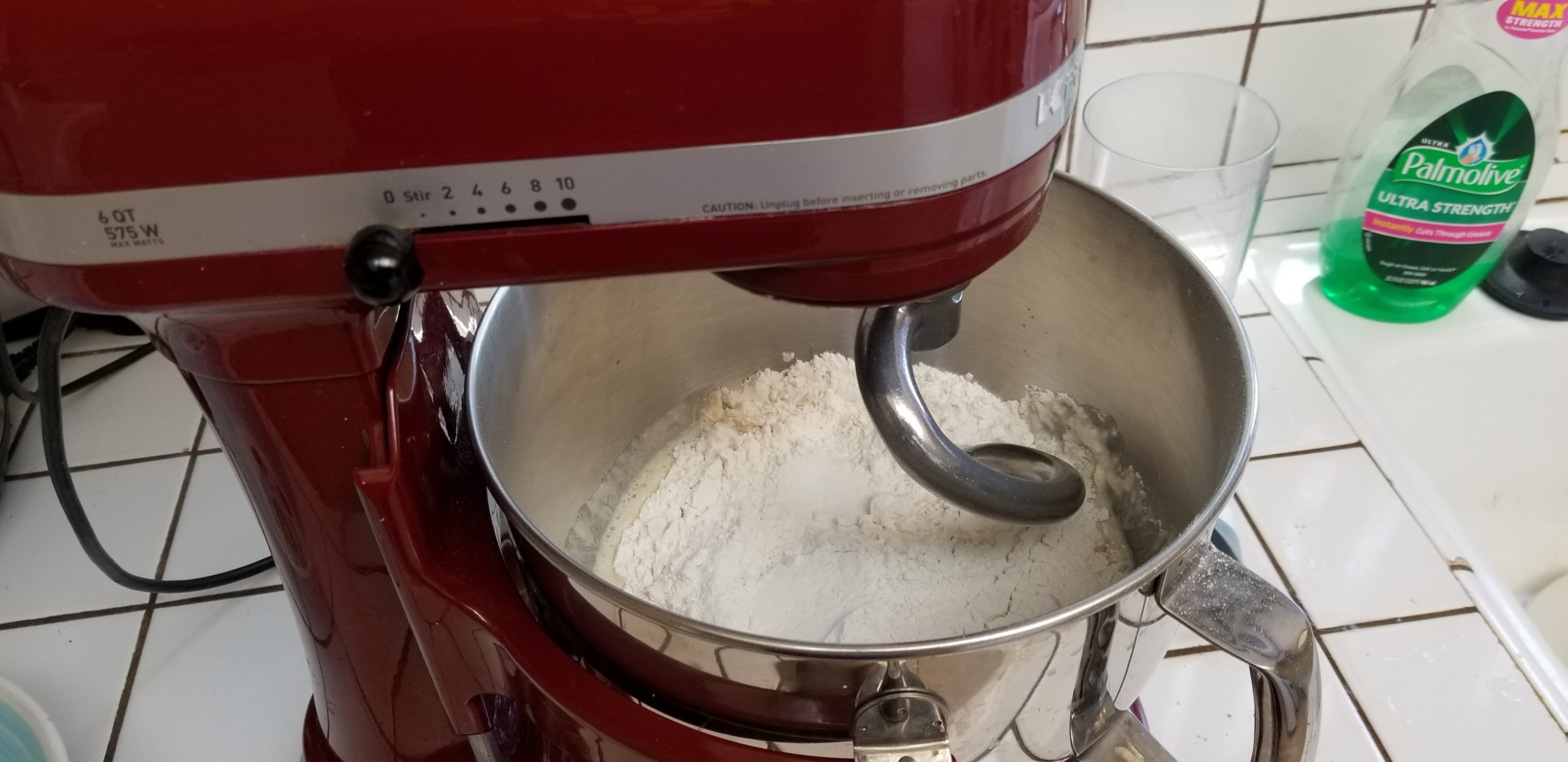 Dump that 110 degree water into the working bowl of your mixer then add in the teaspoon of sugar and the yeast. Let them get busy.