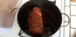 Leave that pig in the pan and dump in a 12 ounce beer. Lager is best here. Cover the pot with a lid and into the 300 degree oven she goes. It’s going to cook for 3 hours to start, then remove the lid and cook for an additional two hours. Yes. Five goddamn hours at 300. We’re trying to duplicate that low and slow shit you hear about all the time.